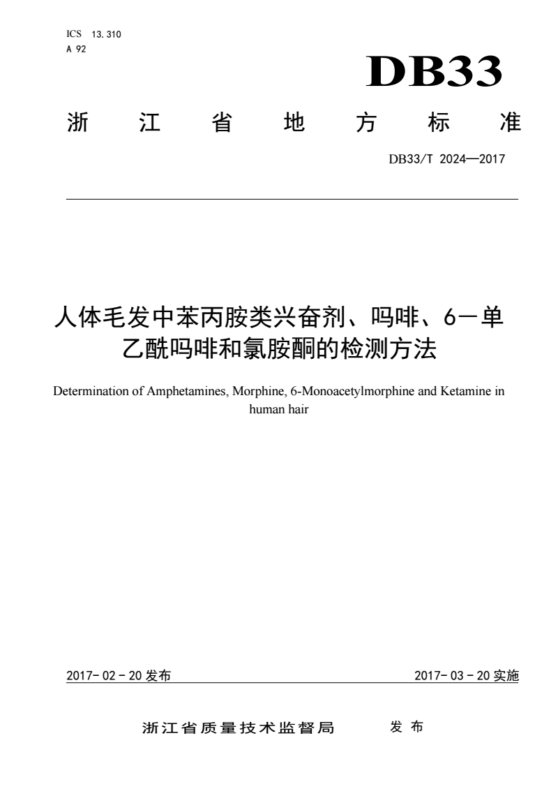 DB33/T 2024-2017 人体毛发中苯丙胺类兴奋剂、吗啡、6-单乙酰吗啡和氯胺酮的检测方法