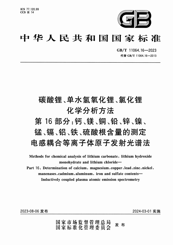 GB/T 11064.16-2023 碳酸锂、单水氢氧化锂、氯化锂化学分析方法 第16部分:钙、镁、铜、铅、锌、镍、锰、镉、铝、铁、硫酸根含量的测定 电感耦合等离子体原子发射光谱法