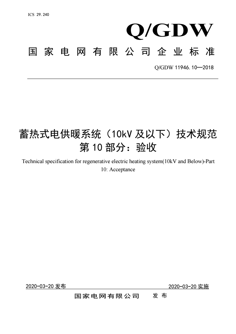 标准名称:蓄热式电供暖系统(10kV及以下)技术规范 第10部分:验收