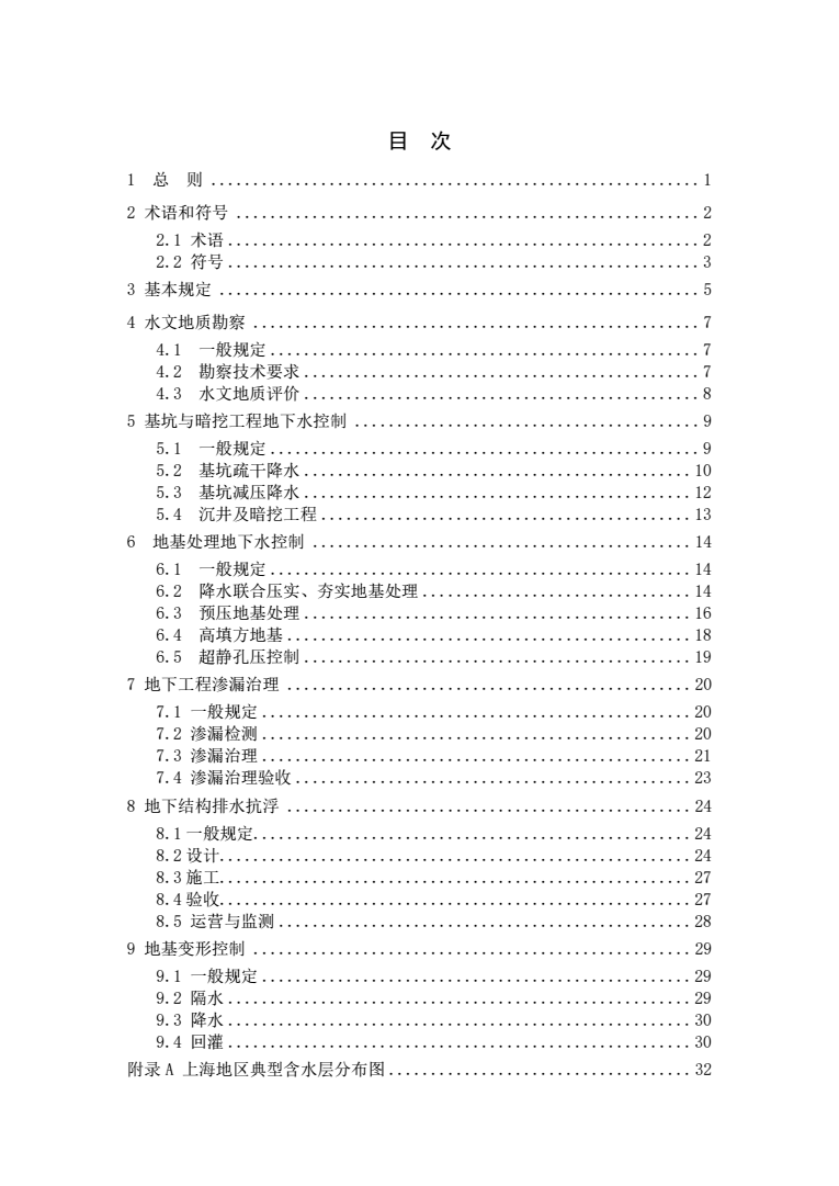 | 为了贯彻执行国家有关技术经济政策,在建设工程地下水控制中保证质量和安全,做到经济合理,保护环境和地下水资源,制定本标准。 本标准适用于上海地区建设工程建设期和运营期地下水控制,包括基坑与暗挖工程、地基处理、地下工程渗漏治理、地下结构排水抗浮、地基变形控制等。