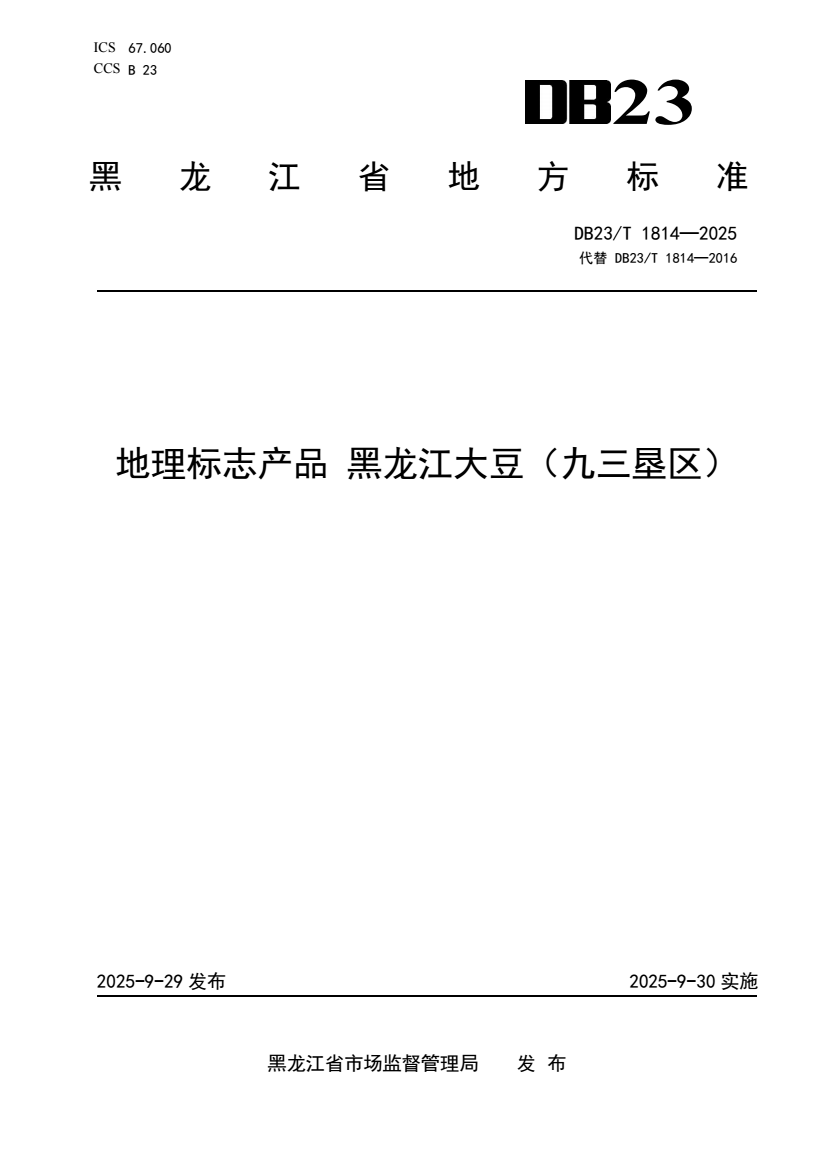 标准名称:地理标志产品 黑龙江大豆(九三垦区)