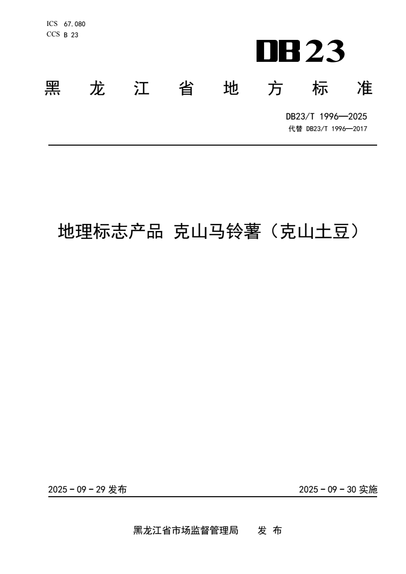 DB23/T 1996-2025 地理标志产品 克山马铃薯(克山土豆)