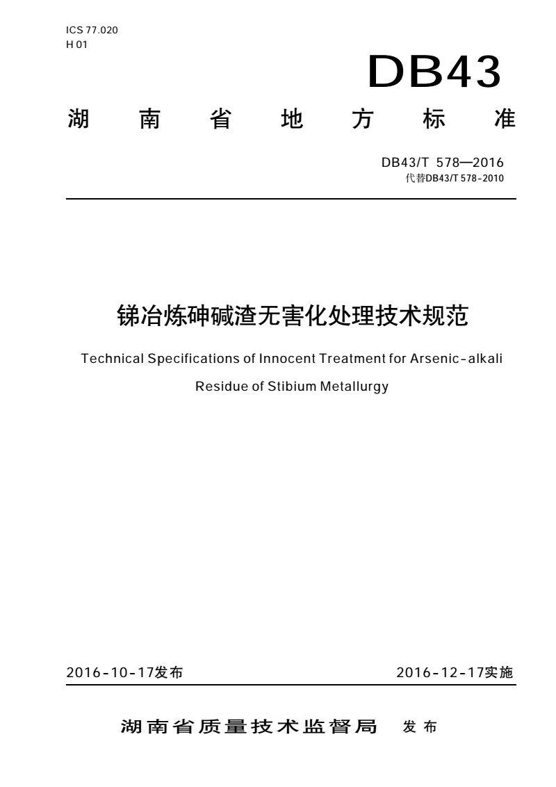 DB43/T 578-2016 锑冶炼砷碱渣无害化处理技术规范 |