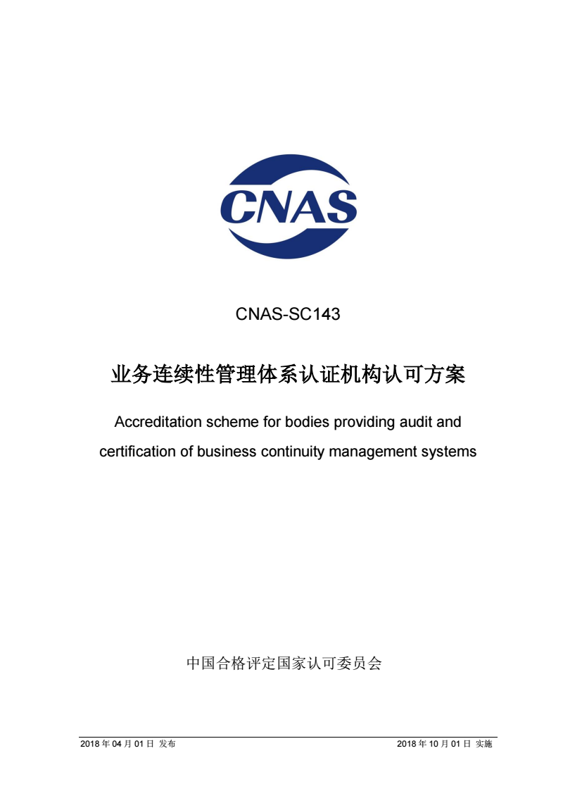CNAS SC143-2018 业务连续性管理体系认证机构认可方案 |