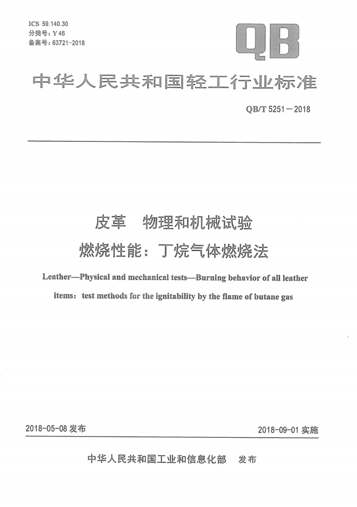 标准名称:皮革 物理和机械试验 燃烧性能:丁烷气体燃烧法