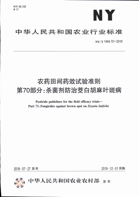 标准名称:农药田间药效试验准则第70部分:杀菌剂防治茭白胡麻叶斑病