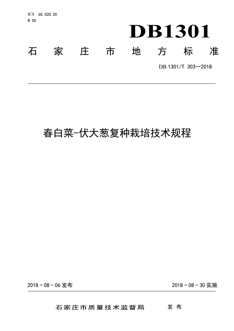 DB1301/T 303-2018 春白菜-伏大葱复种栽培技术规程 |