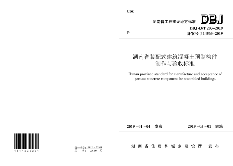 DBJ43/T 203-2019 湖南省装配式建筑混凝土预制构件制作与验收标准 |