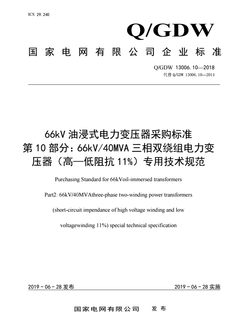 Q/GDW 13006.10-2018 66kV油浸式电力变压器采购标准 第10部分:66kV/40MVA三相双绕组电力变压器(高—低阻抗11%)专用技术规范