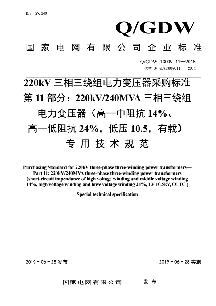 Q/GDW 13009.11-2018 220kV三相三绕组电力变压器采购标准 第11部分:220kV/240MVA三相三绕组电力变压器(高—中阻抗14%、高—低阻抗24%,低压10.5,有载)专用技术规范 |