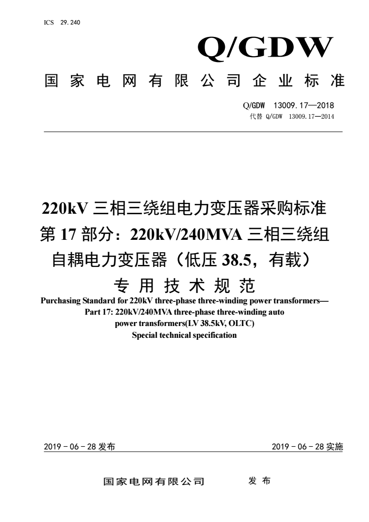 Q/GDW 13009.17-2018 220kV三相三绕组电力变压器采购标准 第17部分:220kV/240MVA三相三绕组自耦电力变压器(低压38.5,有载)专用技术规范 |