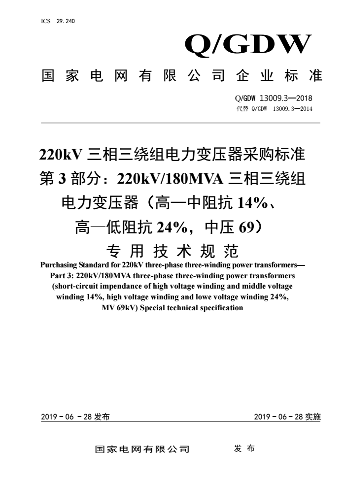 Q/GDW 13009.3-2018 220kV三相三绕组电力变压器采购标准 第3部分:220kV/180MVA三相三绕组电力变压器(高—中阻抗14%、高—低阻抗24%,中压69)专用技术规范 |