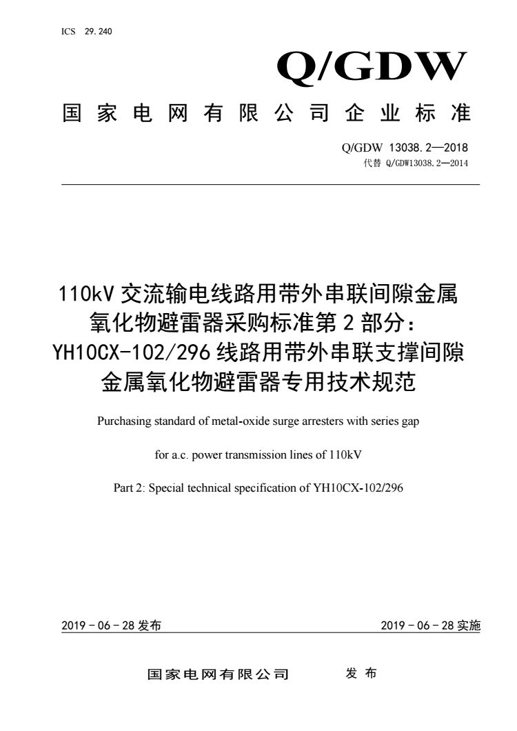 Q/GDW 13038.2-2018 110kV交流输电线路用带外串联间隙金属氧化物避雷器采购标准 第2部分:YH10CX-102/296线路用带外串联支撑间隙金属氧化物避雷器专用技术规范 |
