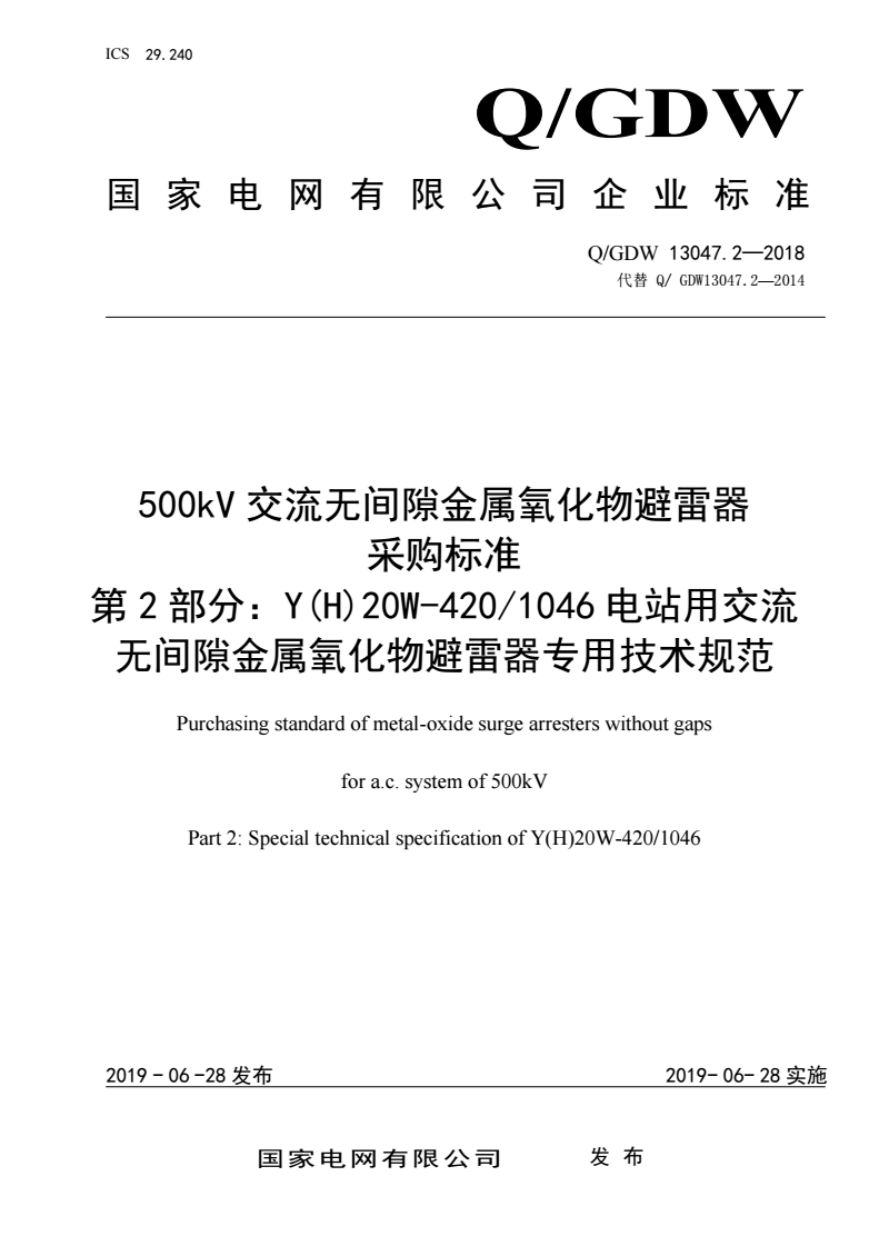 Q/GDW 13047.2-2018 500kV交流无间隙金属氧化物避雷器采购标准 第2部分:Y(H)20W-420/1046电站用交流无间隙金属氧化物避雷器专用技术规范 |