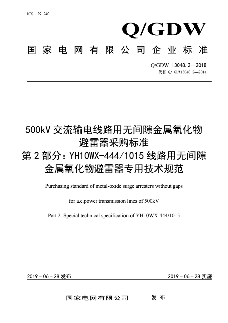 Q/GDW 13048.2-2018 500kV交流输电线路用无间隙金属氧化物避雷器采购标准 第2部分:YH10WX-444/1015线路用无间隙金属氧化物避雷器专用技术规范 |