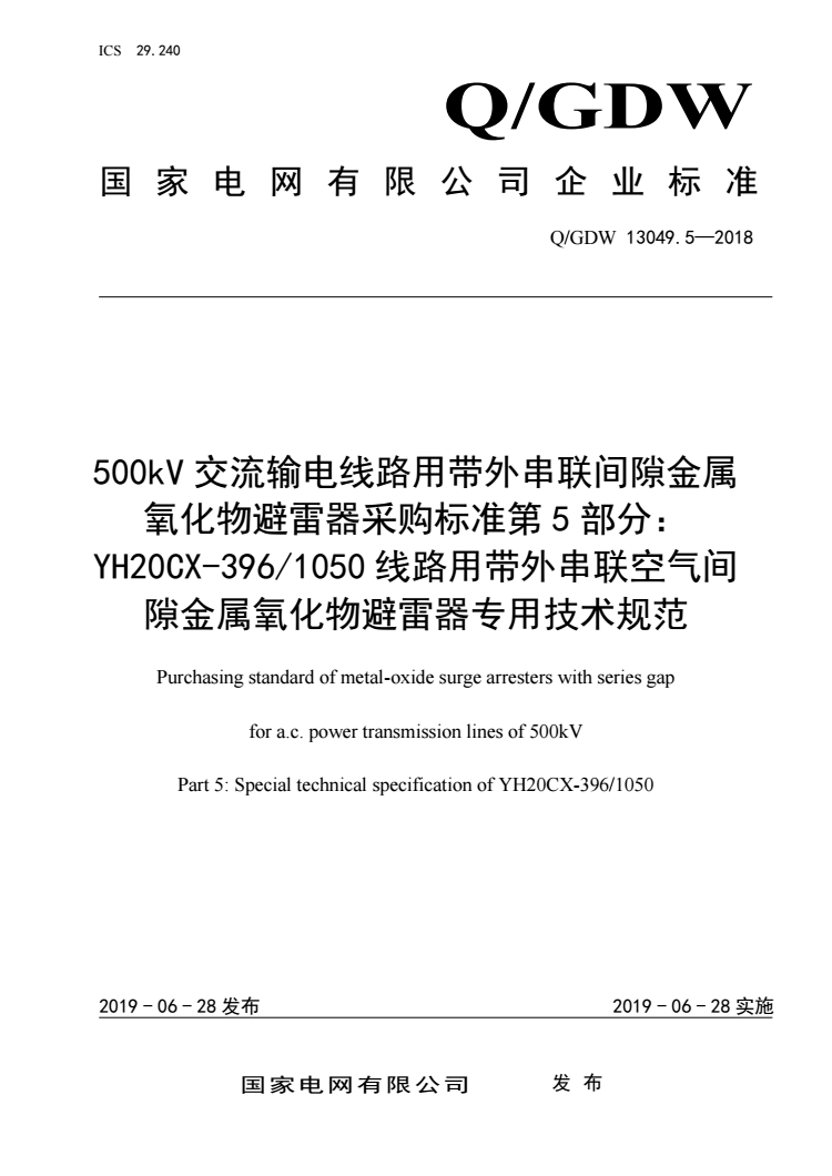 Q/GDW 13049.5-2018 500kV交流输电线路用带外串联间隙金属氧化物避雷器采购标准 第5部分:YH20CX-396/1050线路用带外串联空气间隙金属氧化物避雷器专用技术规范 |