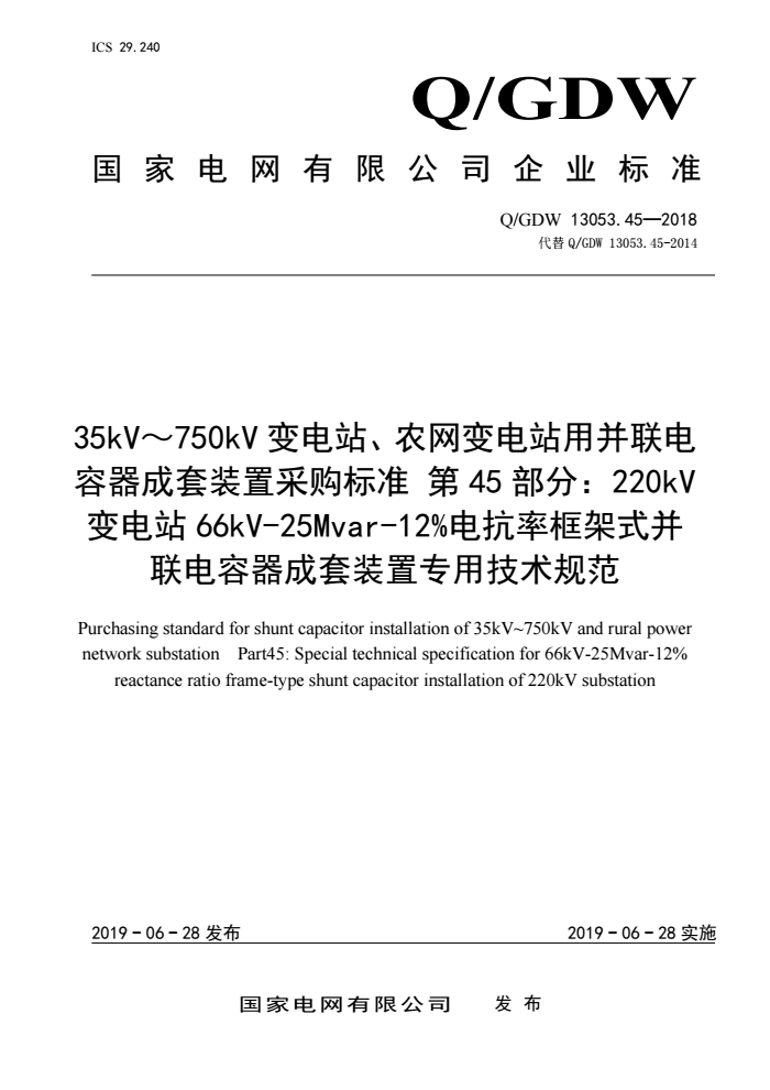 Q/GDW 13053.45-2018 35kV~750kV变电站、农网变电站用并联电容器成套装置采购标准 第45部分:220kV变电站66kV-25Mvar-12%电抗率框架式并联电容器成套装置专用技术规范 |
