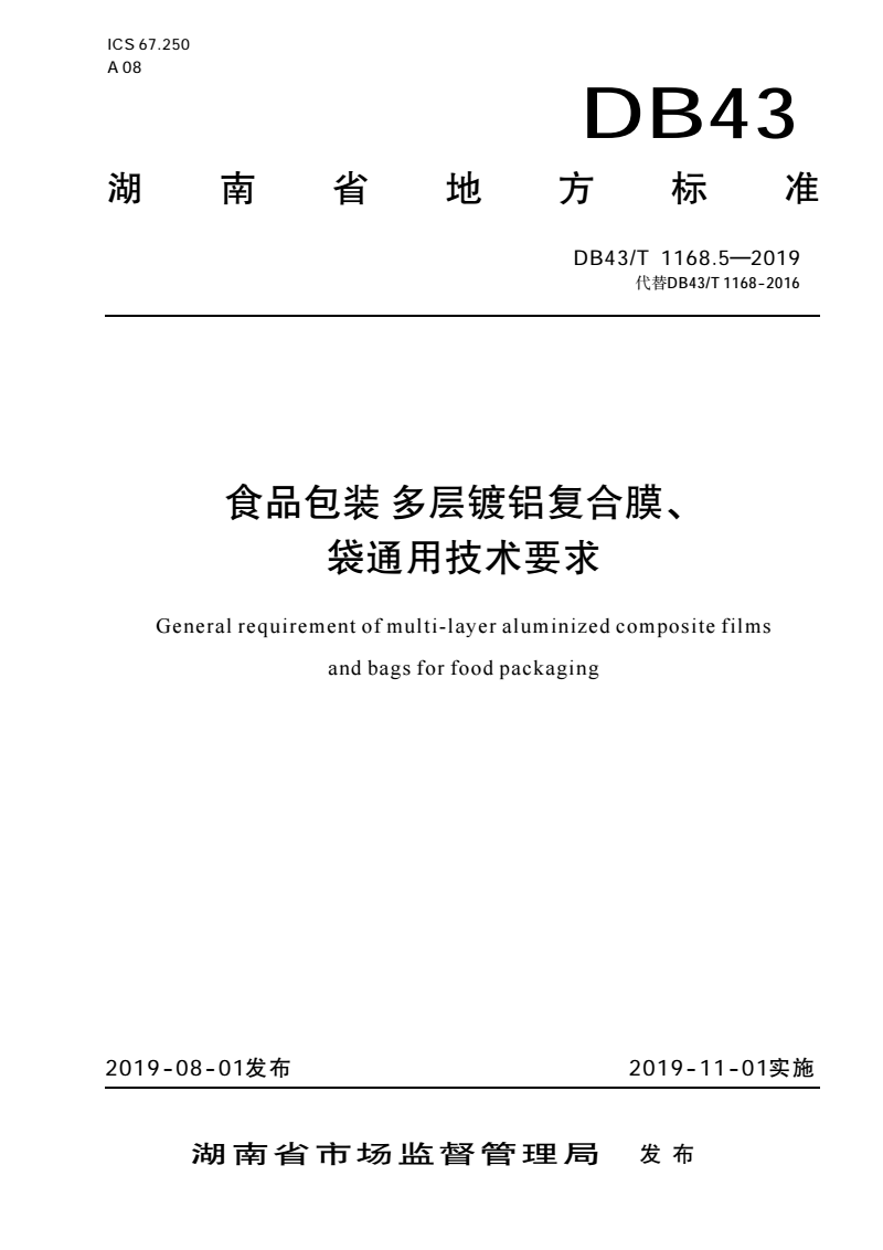 DB43/T 1168.5-2019 食品包装 多层镀铝复合膜、袋通用技术要求 |