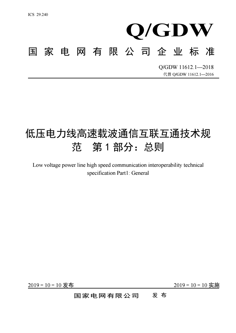 标准名称:低压电力线高速载波通信互联互通技术规范 第1部分:总则