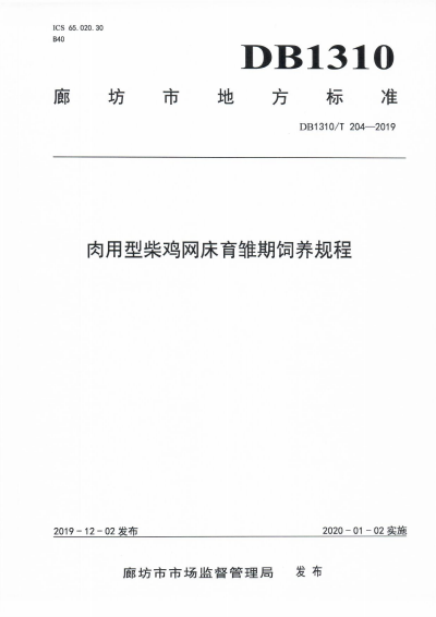 DB1310/T 204-2019 肉用型柴鸡网床育雏期饲养 |