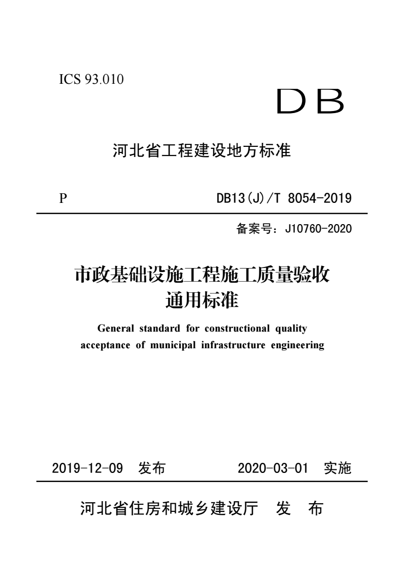 DB13(J)/T 8054-2019 市政基础设施工程施工质量验收通用标准 |