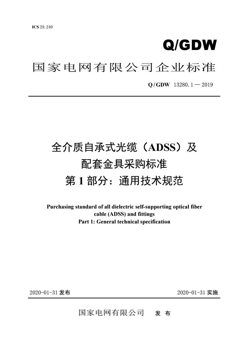 Q/GDW 13280.1-2019 全介质自承式光缆(ADSS)及配套金具采购标准 第1部分:通用技术规范