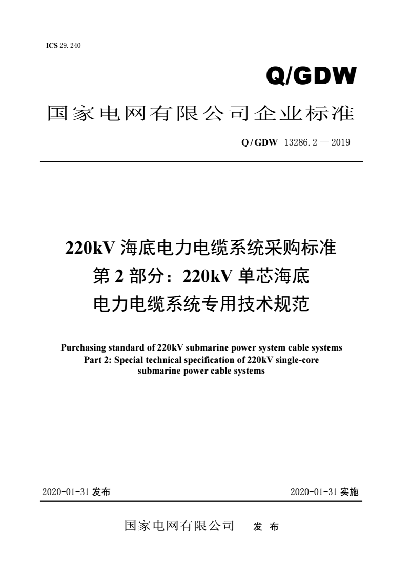 英文名称:Purchasing standard of 220kV submarine power system cable systems Part 2: Special technical specification of 220kV single-core submarine power cable systems