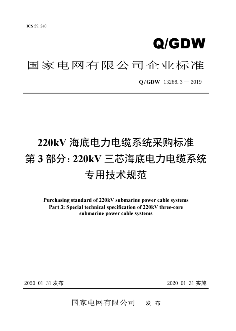 标准名称:220kV海底电力电缆系统采购标准 第3部分:220kV三芯海底电力电缆系统专用技术规范