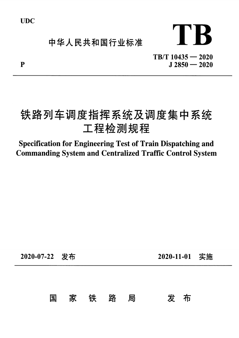英文名称:Specification for Engineering Test of Train Dispatching and Commanding System and Centralized Traffic Control System