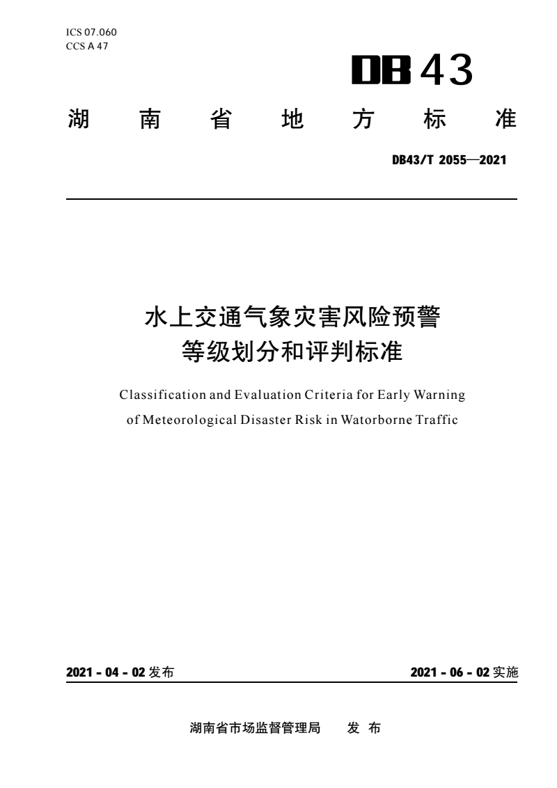 DB43/T 2055-2021 水上交通气象灾害风险预警等级划分预评标准 |
