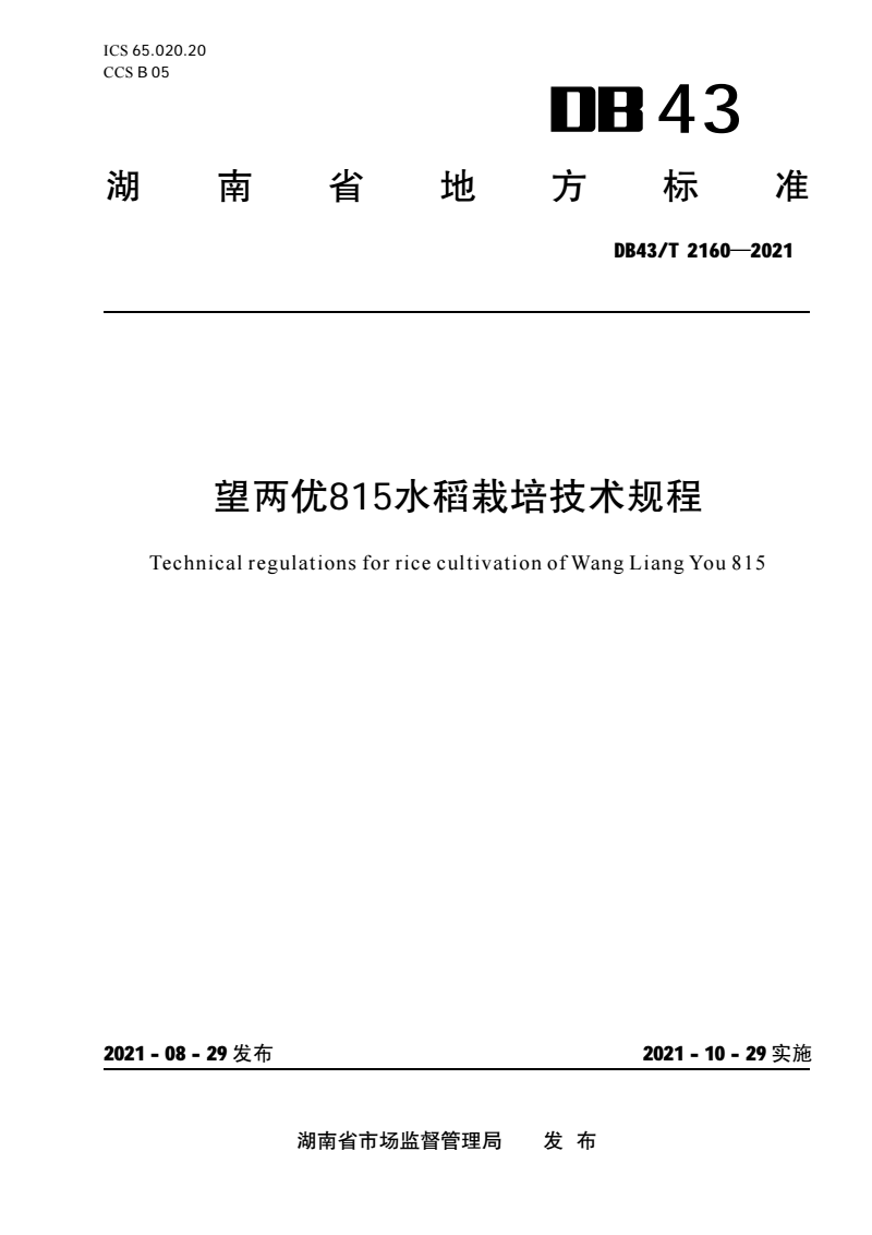 DB43/T 2160-2021 望两优815水稻栽培技术规程 |