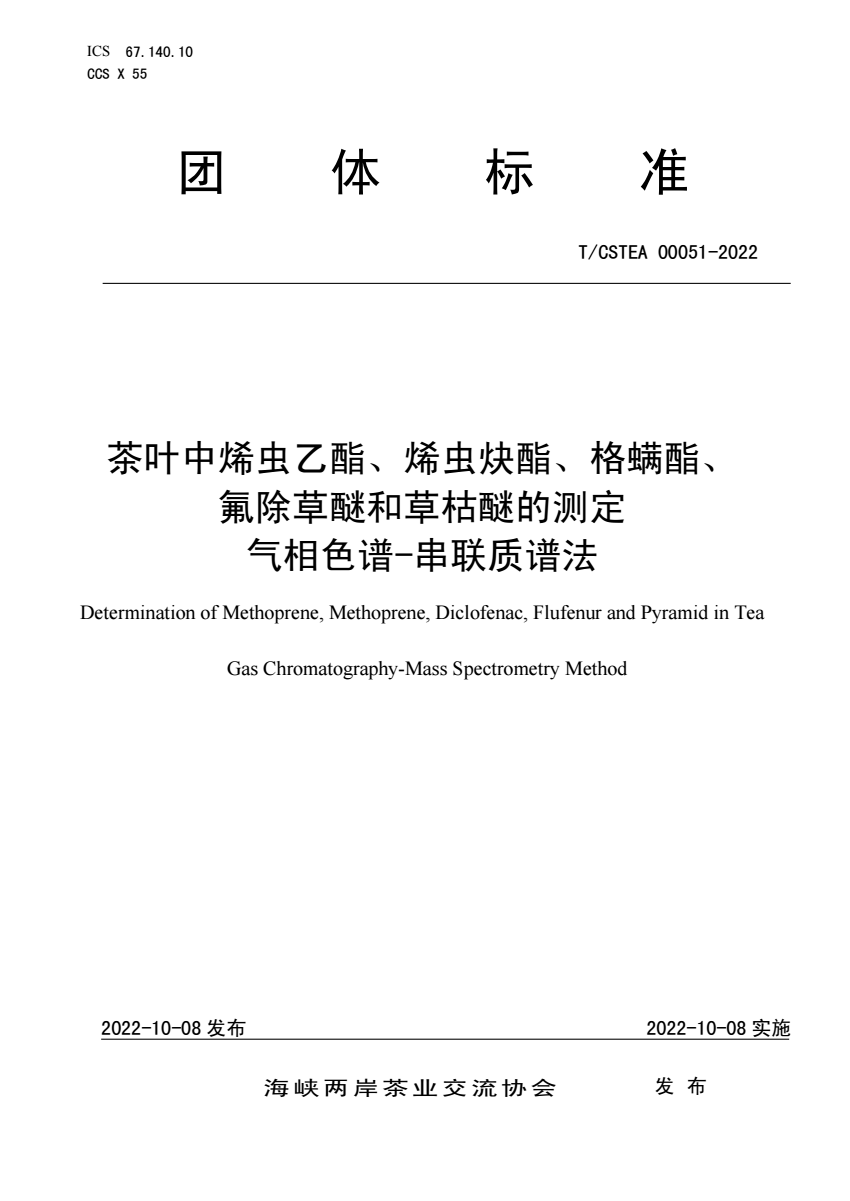 标准名称:茶叶中烯虫乙酯、烯虫炔酯、格螨酯、 氟除草醚和草枯醚的测定 气相色谱-串联质谱法