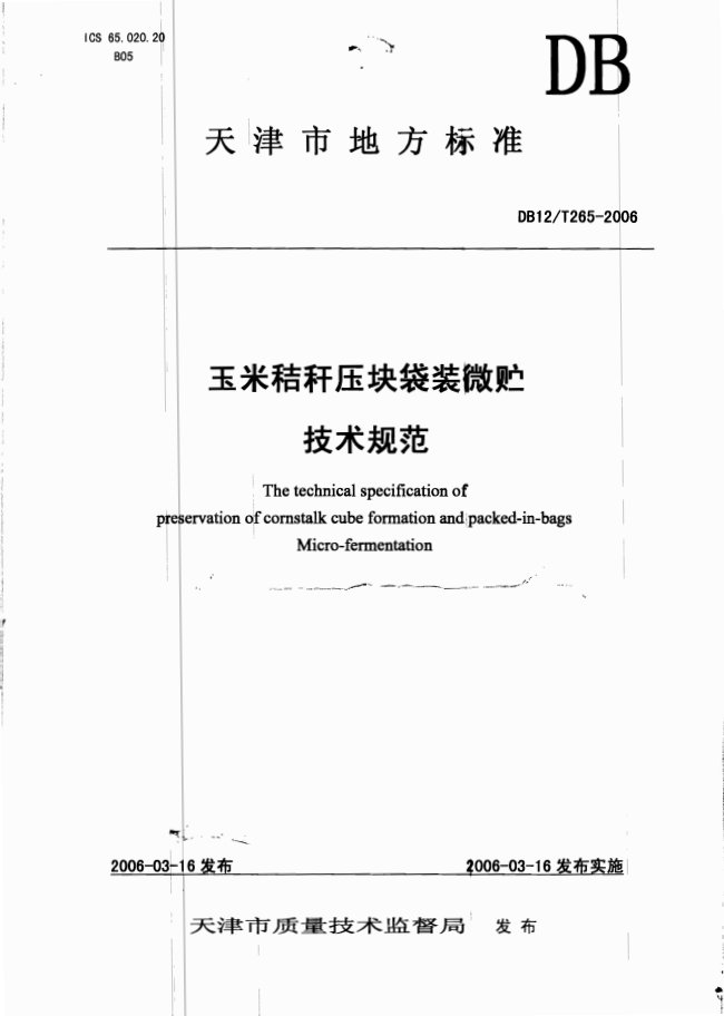 DB12/T 265-2006 玉米秸秆压块袋装微贮技术规范 |