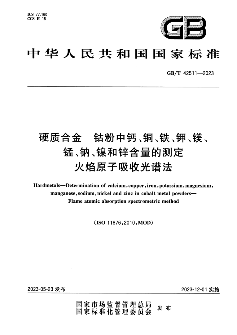标准名称:硬质合金 钴粉中钙、铜、铁、钾、镁、锰、钠、镍和锌含量的测定 火焰原子吸收光谱法