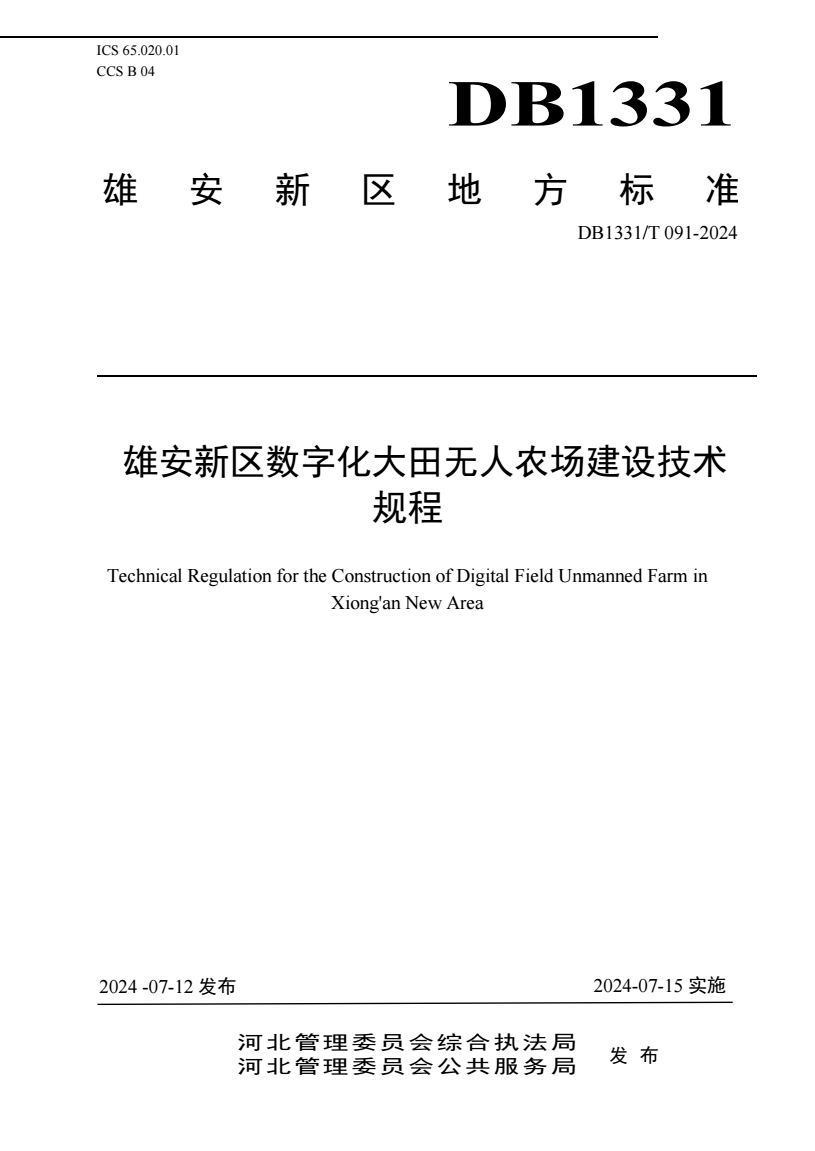 DB1331/T 091-2024 雄安新区数字化大田无人农场建设技术规范 |