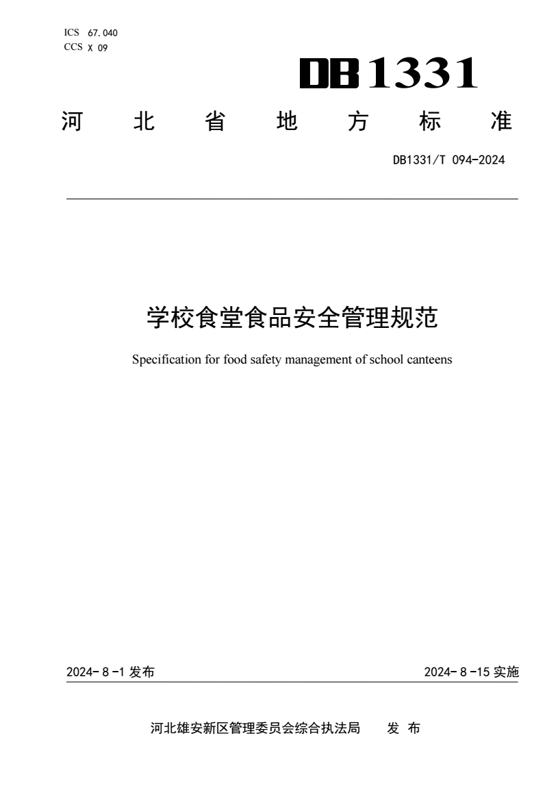 DB1331/T 094-2024 学校食堂食品安全管理规范 |