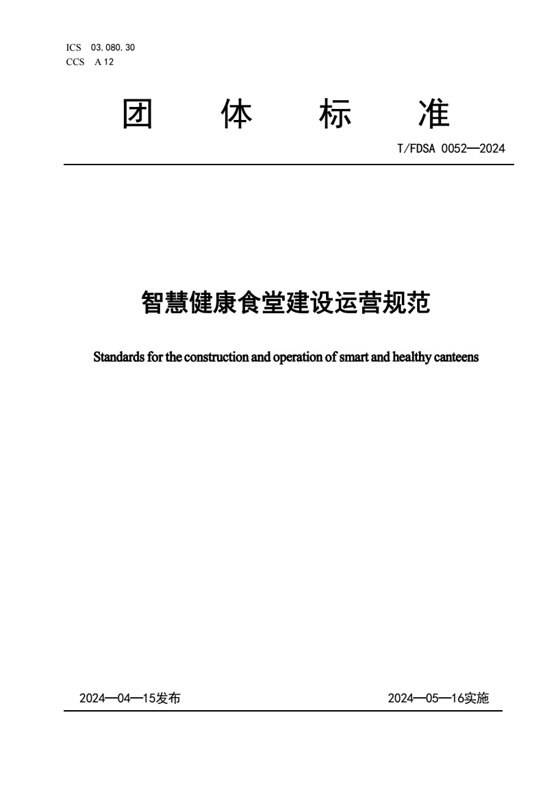 英文名称:Standards for the construction and operation of smart and healthy canteens