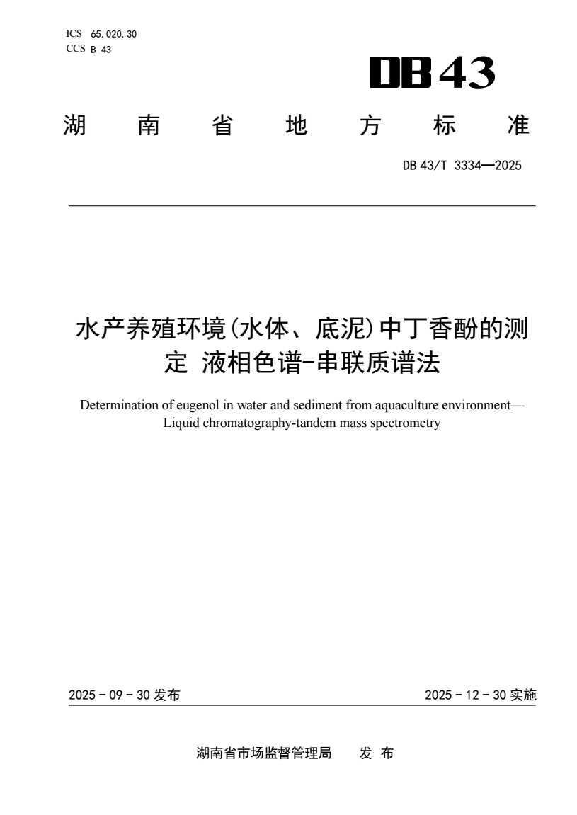 DB43/T 3334-2025 水产养殖环境(水体、底泥)中丁香酚的测定 液相色谱-串联质谱法 |