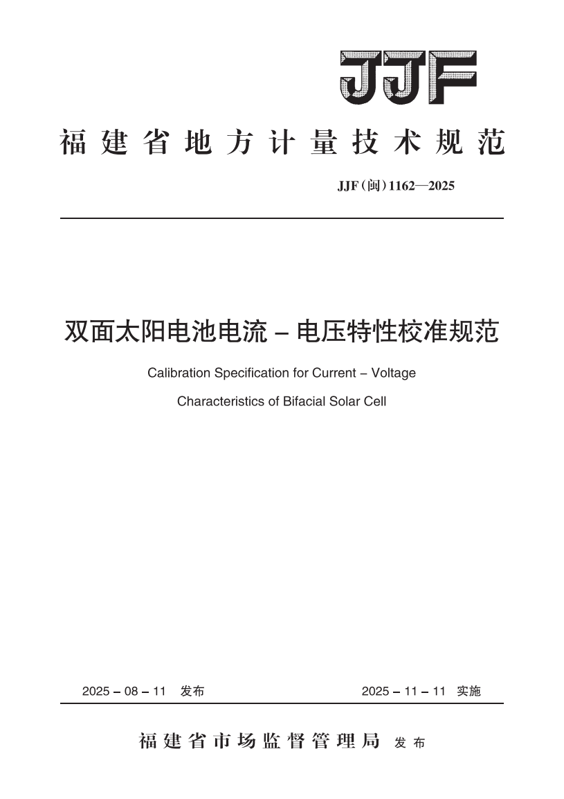 JJF(闽) 1162-2025 双面太阳电池电流-电压特性校准规范 |