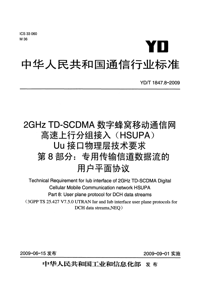 YD/T 1847.8-2009 2GHz TD-SCDMA数字蜂窝移动通信网 高速上行分组接入(HSUPA)Iub接口技术要求 第8部分:专用传输信道数据流的用户平面协议 |