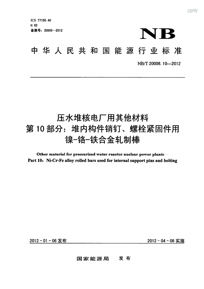 NB/T 20008.10-2012 压水堆核电厂用其他材料 第10部分:堆内构件销钉、螺栓紧固件用镍-铬-铁合金轧制棒