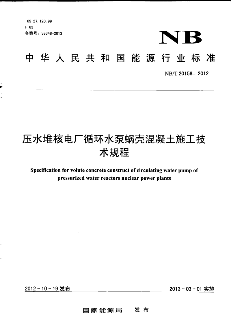 英文名称:Specification for volute concrete construct of circulating water pump of pressurized water reactors nuclear power plants