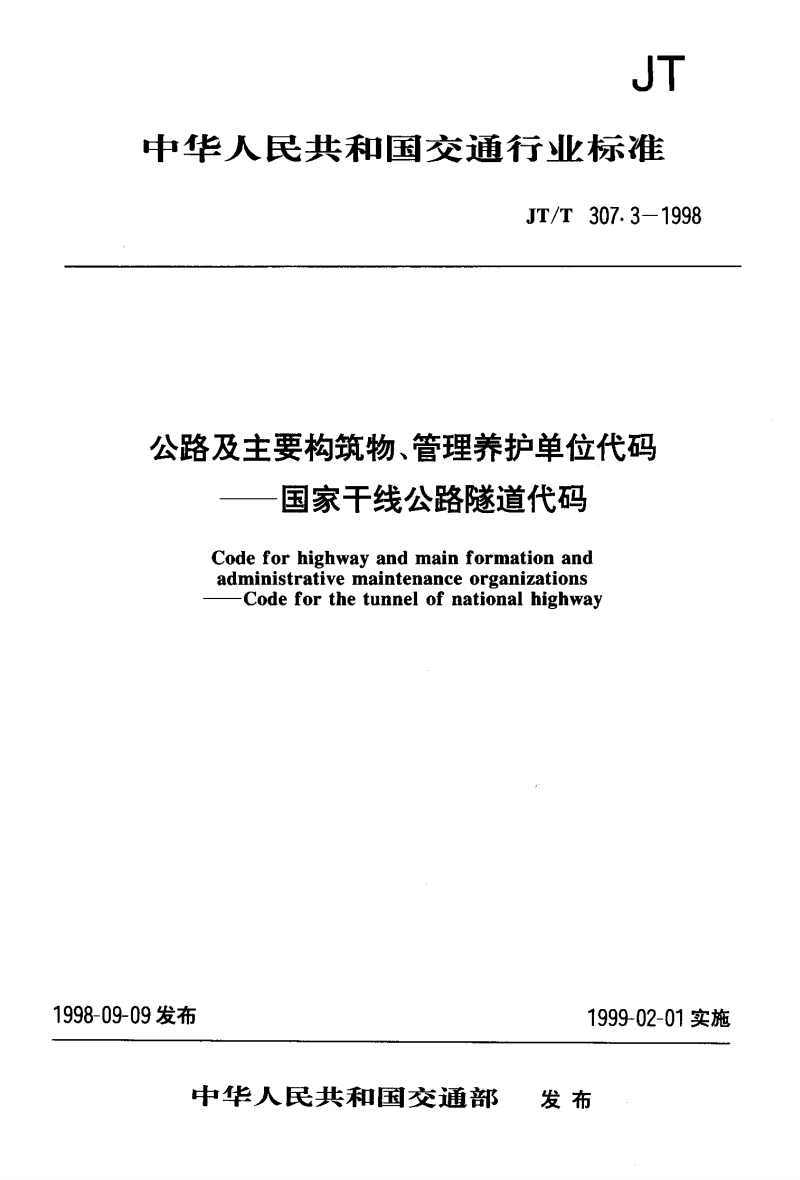 JT/T 307.3-1998 公路及主要构筑物、管理养护单位代码 国家干线公路隧道代码