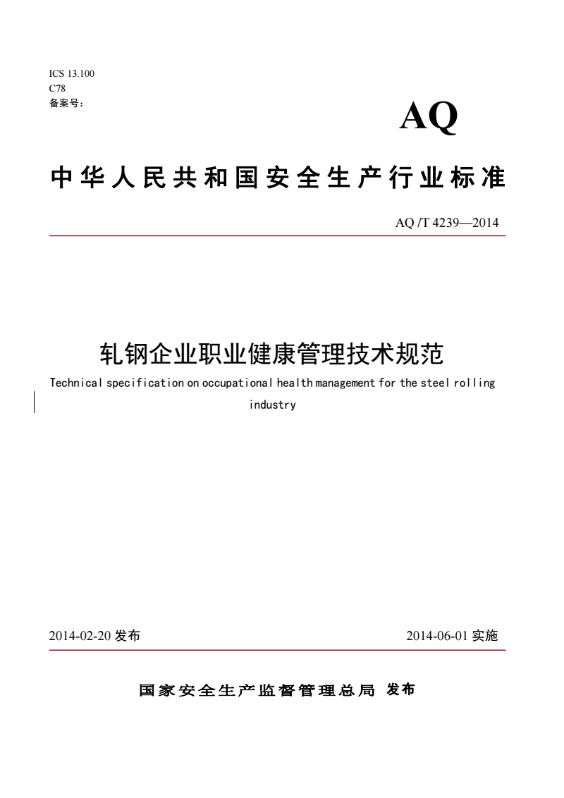 英文名称:Technical specification on occupational health management for the steel rolling industry