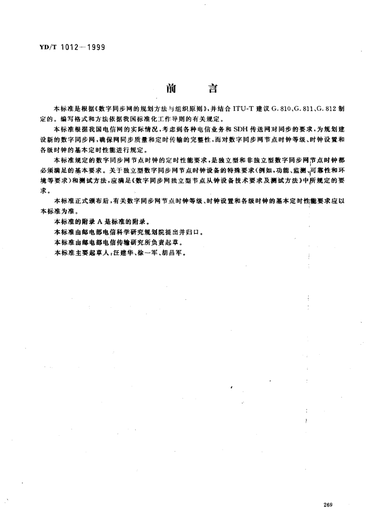 本标准规定了1级基准时钟、2级节点时钟和3级节点时钟的频率准确度、抖动/漂动、相位瞬变、相位不连续性、保待能力等定时特性。关于节点从钟定时特性的测试方法,在本标准中不再作规定,可参照《数字同步网独立型节点从钟设备技术要求及测试方法》。关于1级基准时钟的测试方法待进一步研究后另行规定。