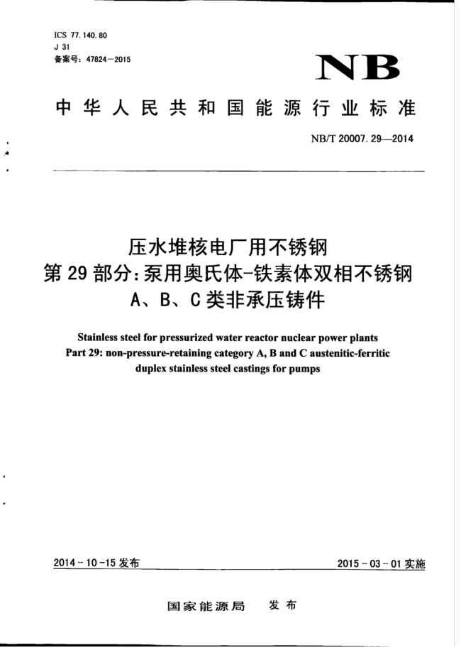标准名称:压水堆核电厂用不锈钢 第29部分:泵用奥氏体-铁素体双相不锈钢A、B、C类非承压铸件