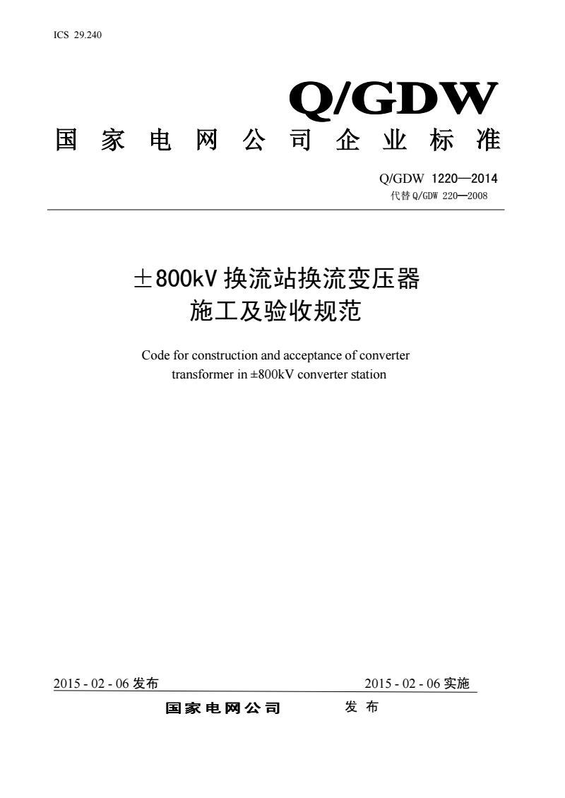 英文名称:Code for construction and acceptance of converter transformer in ±800kV converter station