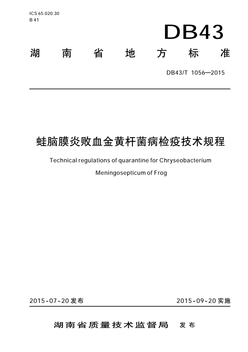 DB43/T 1056-2015 蛙脑膜炎败血金黄杆菌病检疫技术规程 |
