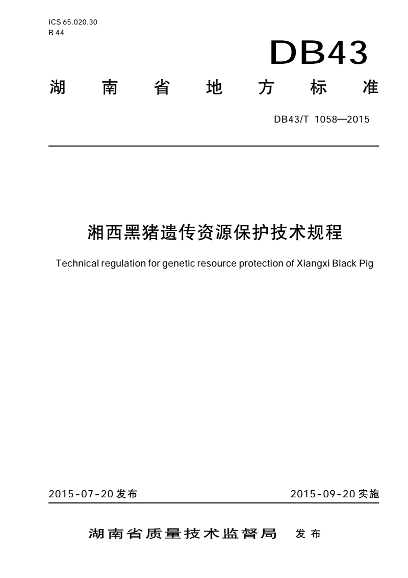 DB43/T 1058-2015 湘西黑猪遗传资源保护技术规程 |